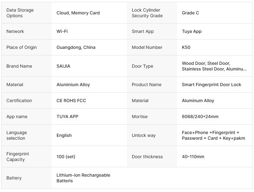 এছাড়াও এতে আছে Biometric Fingerprint Recognition System, যা অতিরিক্ত নিরাপত্তা নিশ্চিত করে। Tuya WiFi App Control সাপোর্টের মাধ্যমে মোবাইল ফোন থেকেই দরজা লক/আনলক, ইউজার ম্যানেজমেন্ট এবং অ্যাক্সেস মনিটর করা যায়।