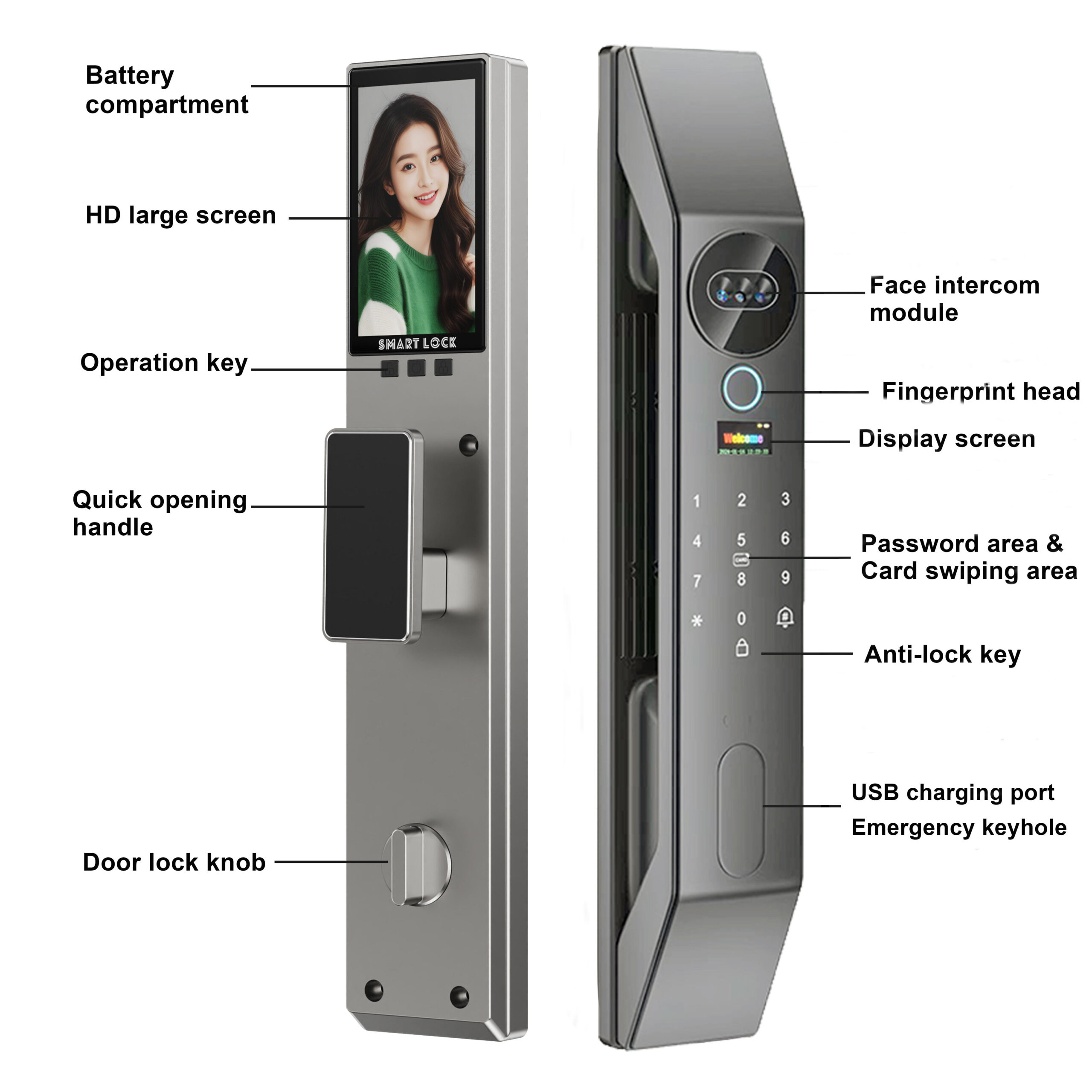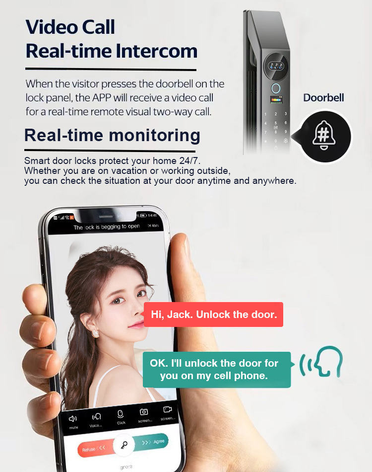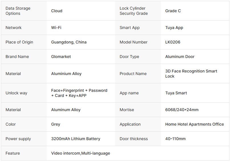 এই Glomarket 3D Face Recognition Automatic Tuya WiFi Smart Door Lock আধুনিক হোম সিকিউরিটির জন্য একটি প্রিমিয়াম ও শক্তিশালী সমাধান। এতে রয়েছে 3D Facial Recognition Technology, যা দ্রুত ও নির্ভুলভাবে ব্যবহারকারী শনাক্ত করে দরজা আনলক করে।