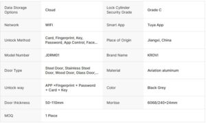 এই Premium Tuya Cloud WiFi Smart Door Lock আধুনিক হোম সিকিউরিটির জন্য একটি অল-ইন-ওয়ান স্মার্ট সল্যুশন। এতে রয়েছে Biometric Face Recognition Technology, যা দ্রুত ও নির্ভুলভাবে মুখ শনাক্ত করে দরজা আনলক করে।