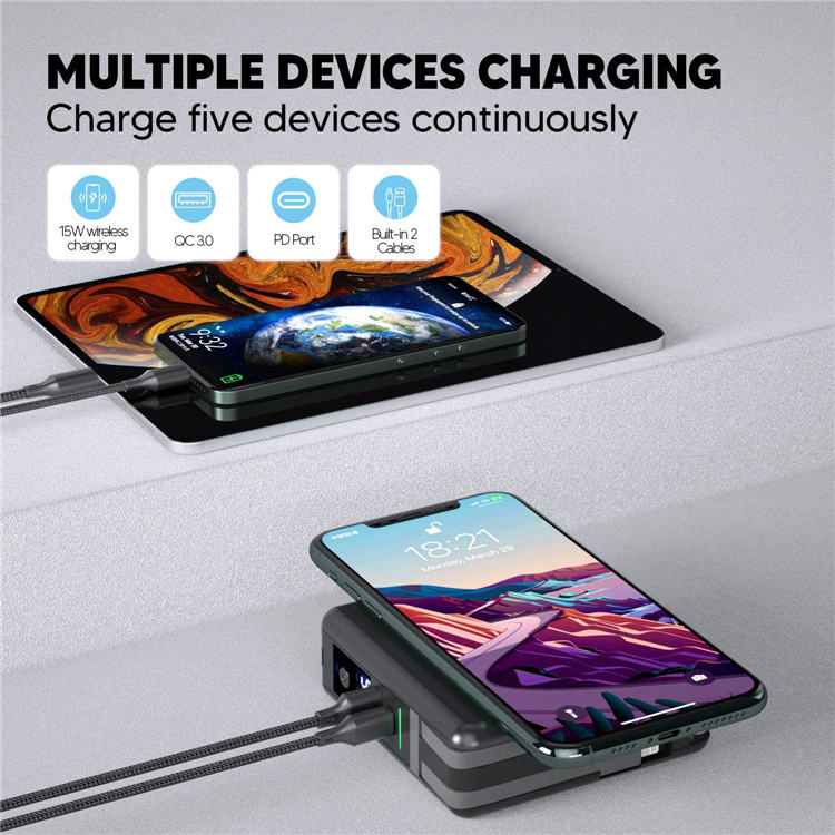 এতে রয়েছে Built-in Multiple Cables, তাই আলাদা চার্জিং কেবল বহনের ঝামেলা নেই। এছাড়াও Wireless Charging Support থাকায় কেবল ছাড়াই ফোন চার্জ করা যায়। কমপ্যাক্ট ও পোর্টেবল ডিজাইনের কারণে এটি ভ্রমণ, অফিস বা দৈনন্দিন ব্যবহারের জন্য একদম পারফেক্ট।