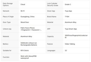 এই TYSH Tuya Smart Door Lock হলো আধুনিক নিরাপত্তার একটি সম্পূর্ণ স্মার্ট সমাধান। এতে রয়েছে Fingerprint Unlock, WiFi Connectivity এবং Built-in Camera সহ Active Video Intercom, যা আপনার ঘর বা অফিসের নিরাপত্তাকে আরও এক ধাপ এগিয়ে নিয়ে যায়।